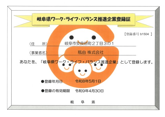 当社はこのたび、従業員の「仕事と家庭の両立支援」に取り組む企業である「岐阜県ワーク・ライフ・バランス推進企業」として登録されました。